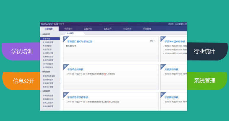 为管理部门提供创造了有效的监管平台,按交通部2016新规范,实现培训机构,在训学员,培训学时,教练和车辆的监管功能